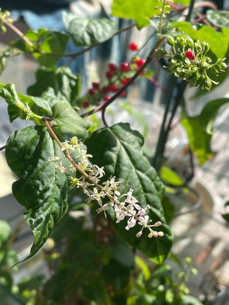 緑の葉っぱに白い花と赤い実の3大競演💕年明けからにぎやかに咲き続けてます数珠珊瑚❣️身の丈60センチは超えてます✌️