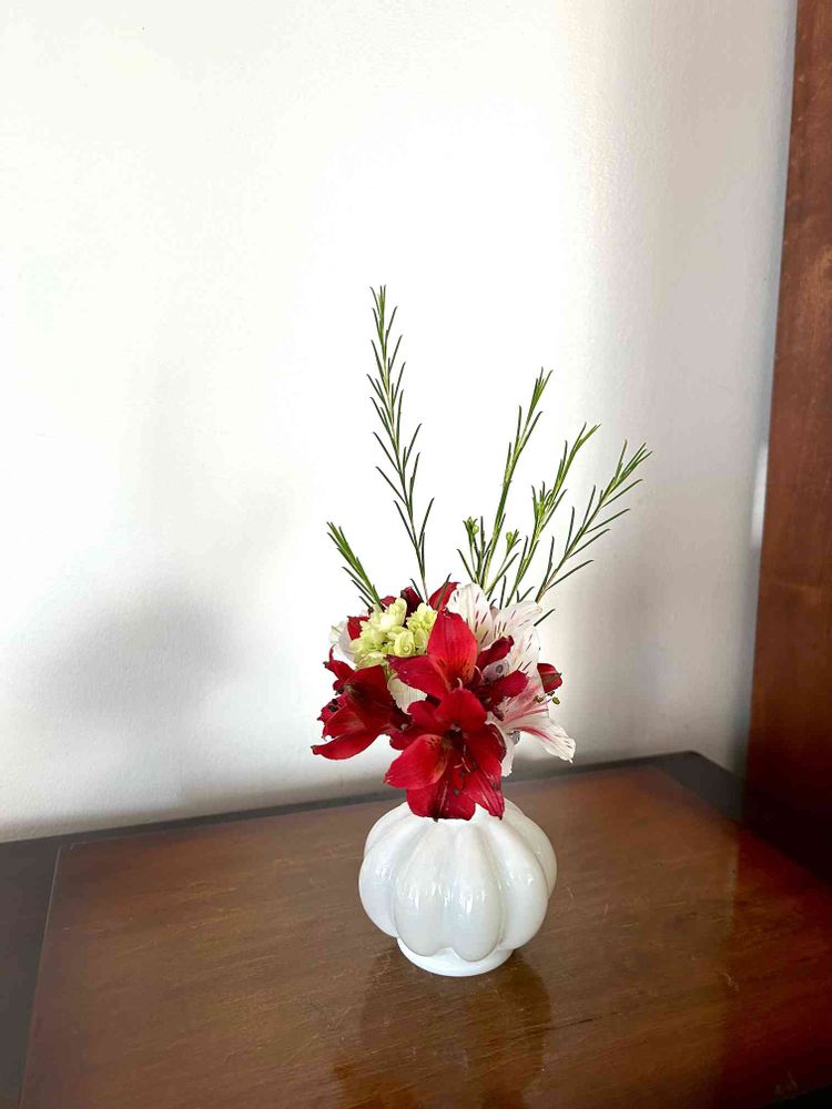 高低差の美しいお花と白い可愛い花器が、艶やかにシンクロナイズしていますね。素敵です。