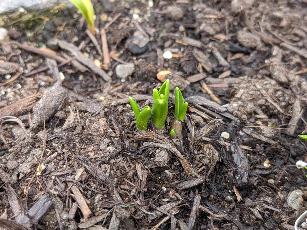 球根釣鐘草もちょこちょこ出てきました。現在頭が見えてきたのは3株。