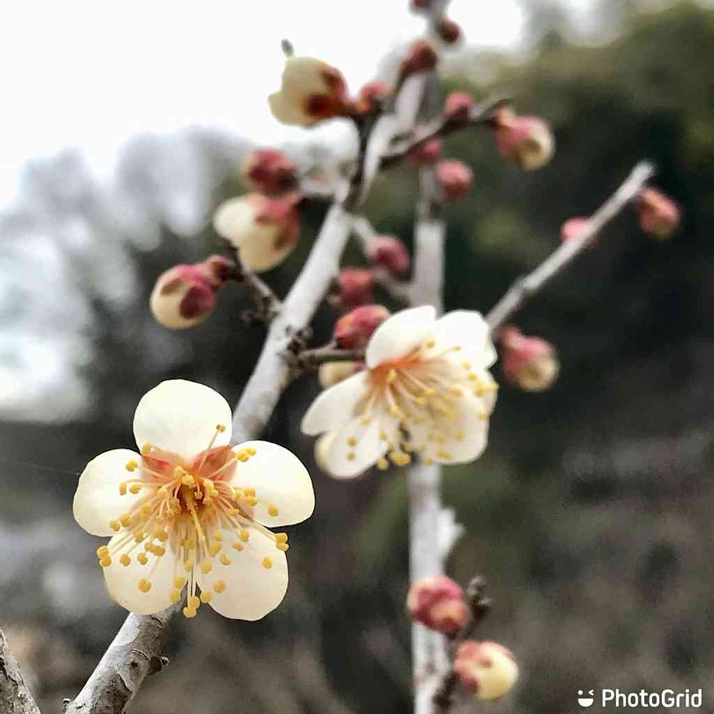 週末土曜☁️、果樹園の早生梅の花🌸がちらほら咲き始めてた😃。