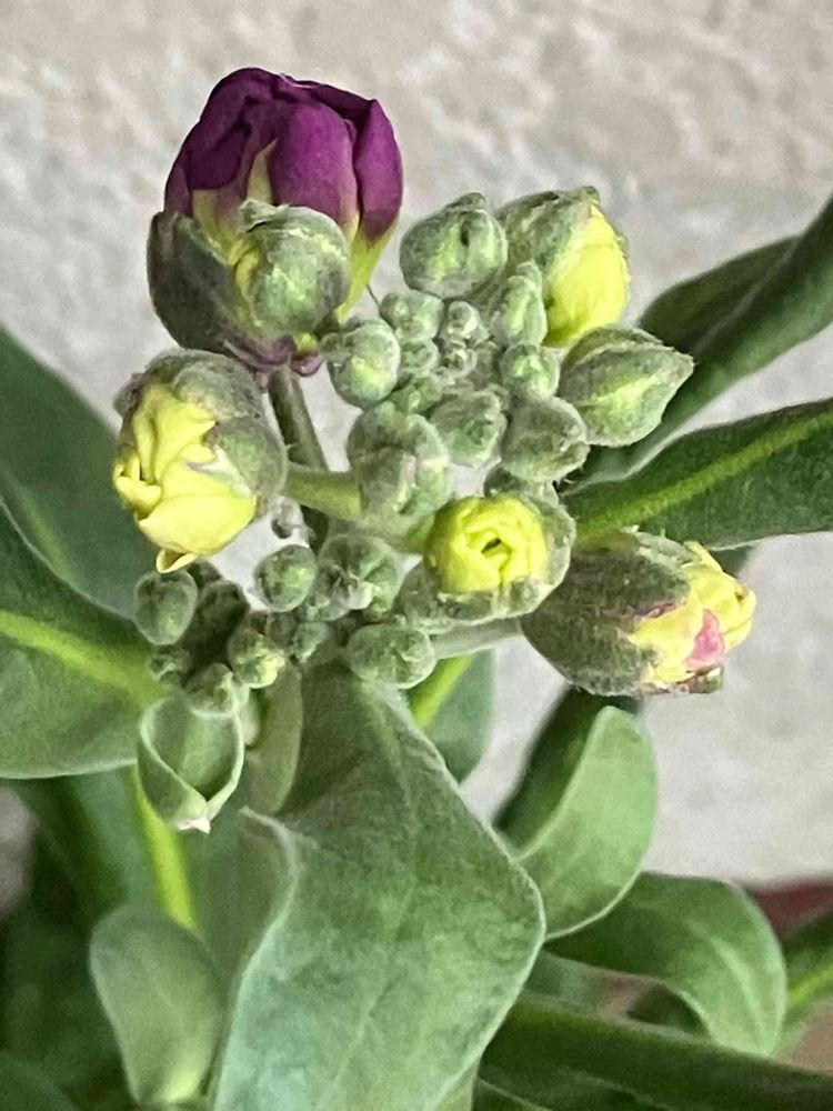 小さな苗から育ててきた寄せ植えのストックにつぼみがつきました