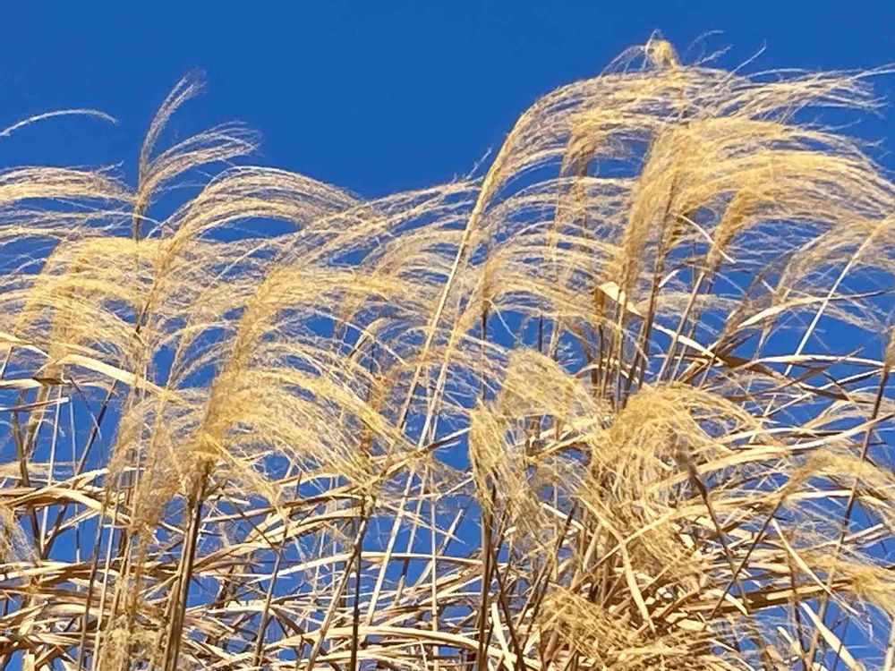 穂が黄色みが強くなり、川の近くの土手で、風になびいていました。