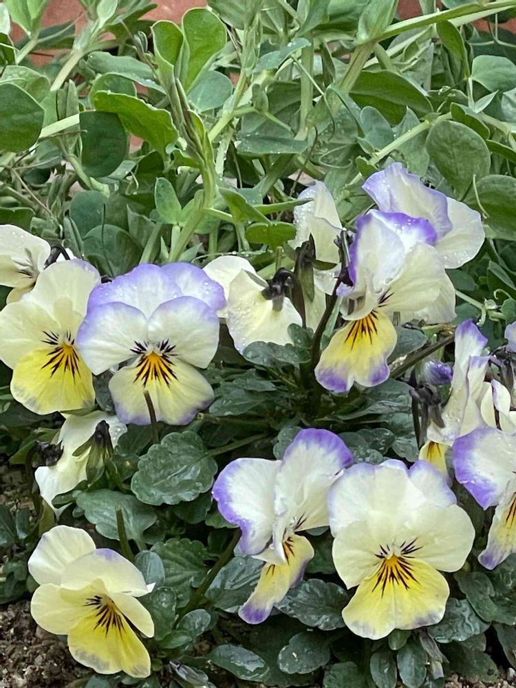 雨に☂️濡れたビオラちゃん。後ろのスイートピーも伸びています。