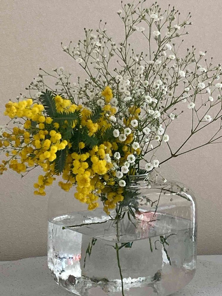 四角い透明ボコボコグラス花器にいけられたのですね?柔らかい花材と優しい四角い透明花器が、対照さを引き立たさせて美しい造形に仕上がっていますね❣️素敵です🥰