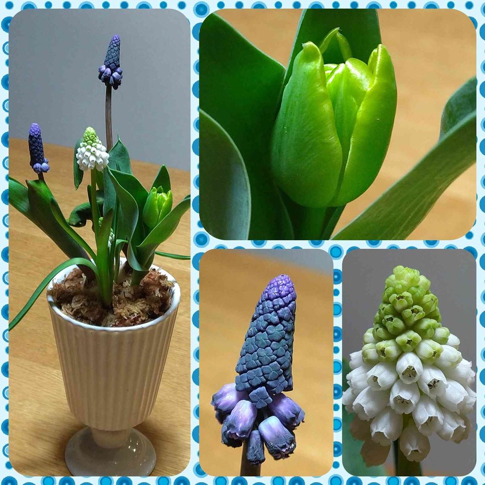 紫色のムスカリと白色のムスカリ、それからグリーン(?!)のチューリップの水苔寄せ植えです🪴✨