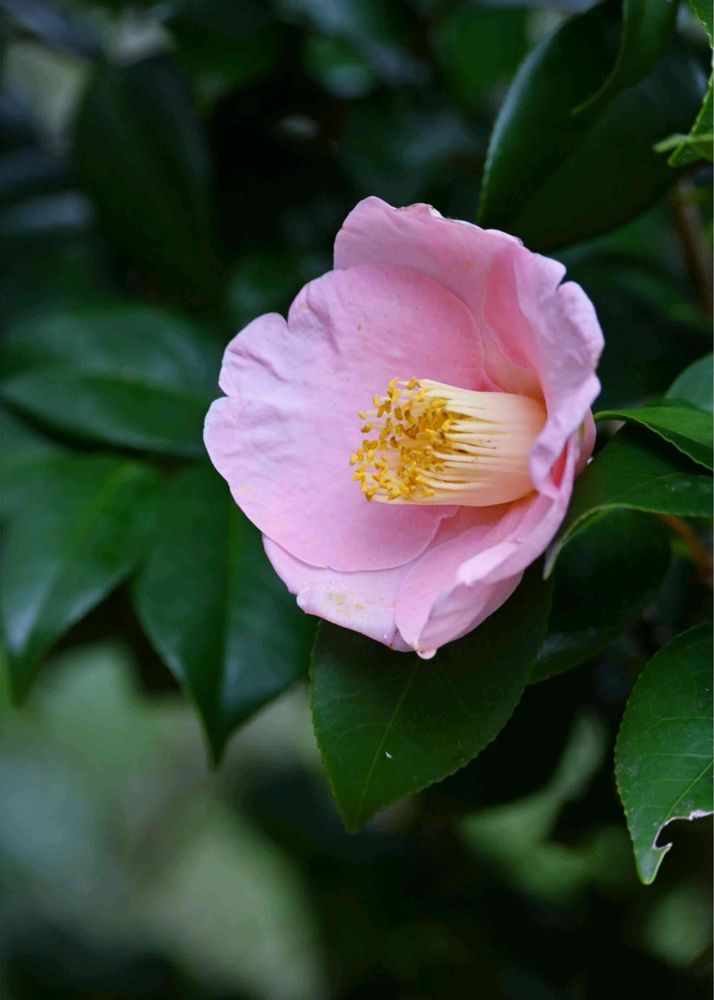 常緑の葉に囲まれた一輪の薄いピンク色の椿