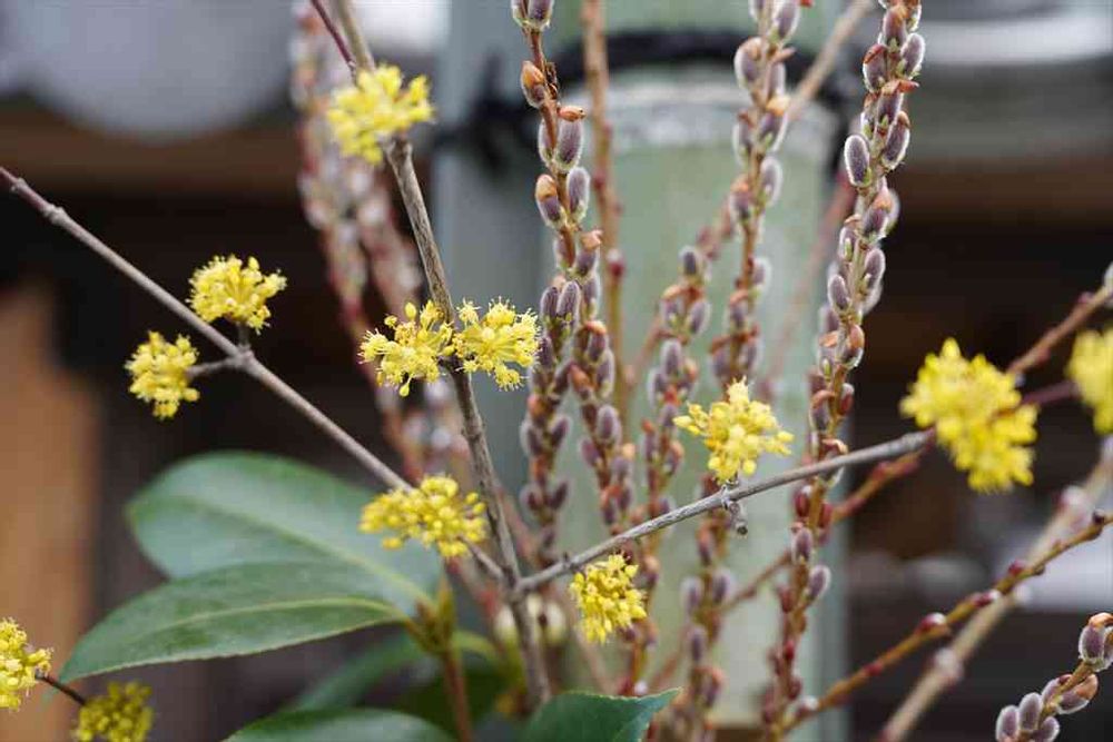サンシュユとネコヤナギ。昨日の真壁のひな祭り散歩で見かけた生け花です。