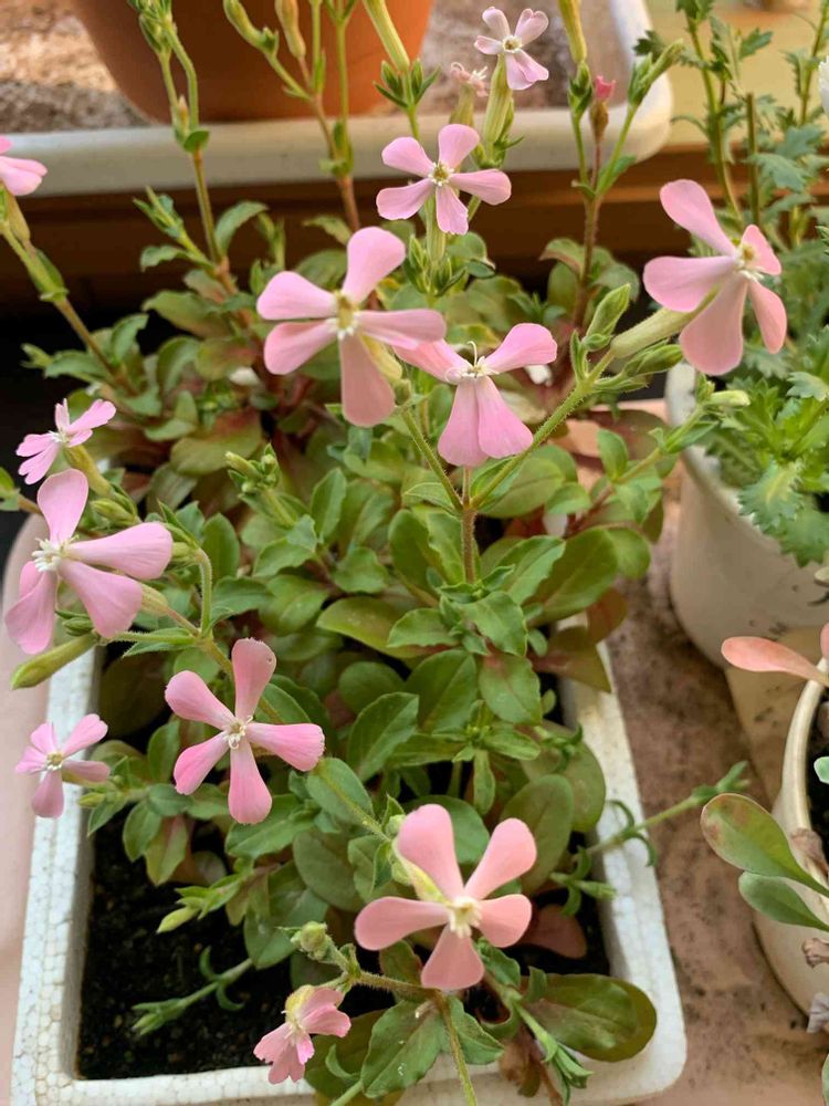 発泡スチロールの箱に種を蒔いておいたシレネライトピンクパンサーが,植え替え前に咲き出しました🫢