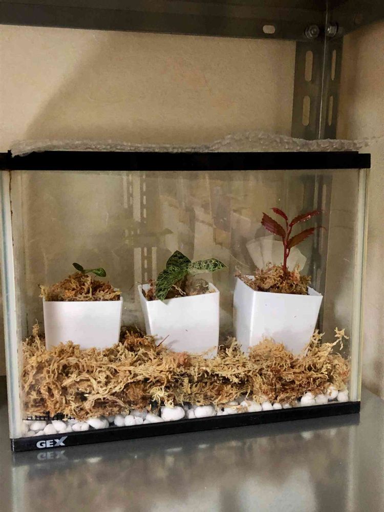 水苔を敷いてさらに薬の入ってた小さなプラスチック容器にコーヒーフィルターを差し込んだ簡易加湿器で多湿を演出。