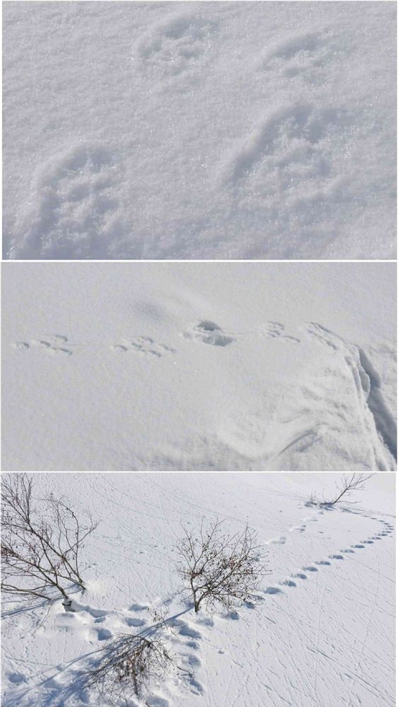 積雪の重みで倒れた木々の冬芽が食糧になるのか、樹と樹の間を縫うように足跡が続いていました。