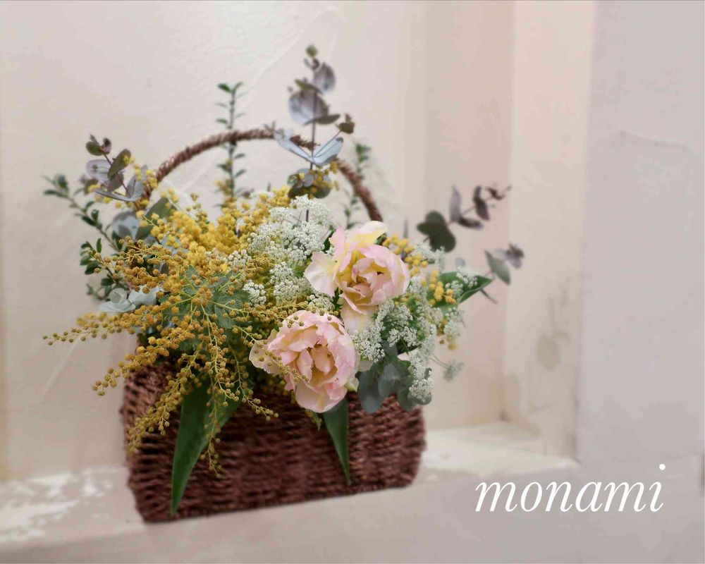ミモザが入って春らしいアレンジですね🧺
