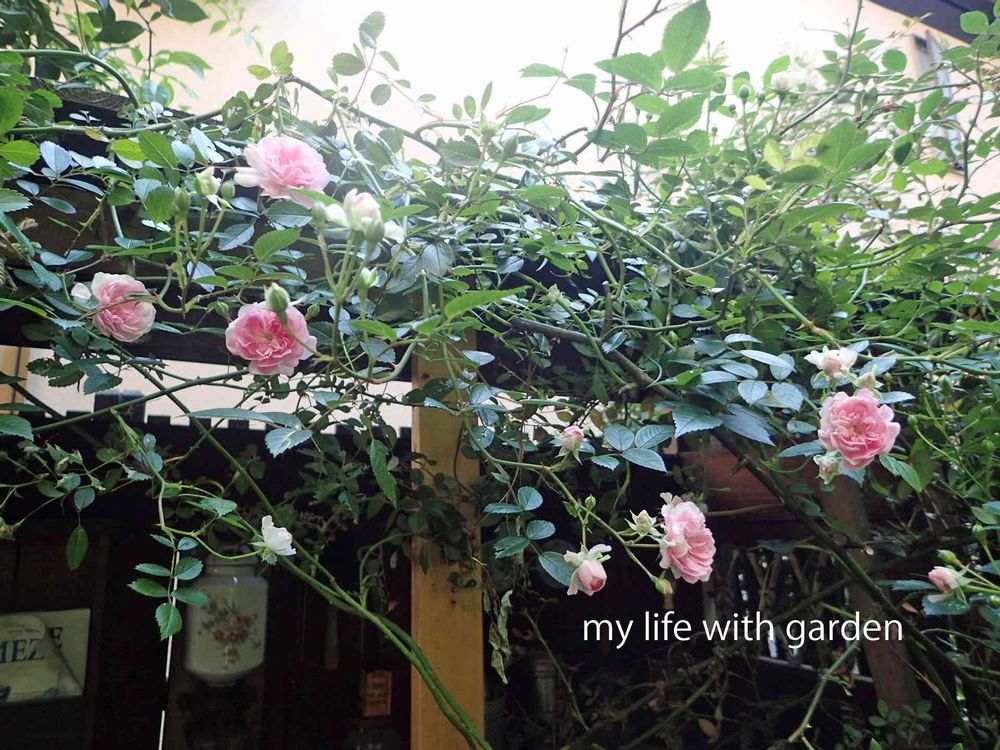 小屋に誘引したつるばら芽衣が咲き始めました♪