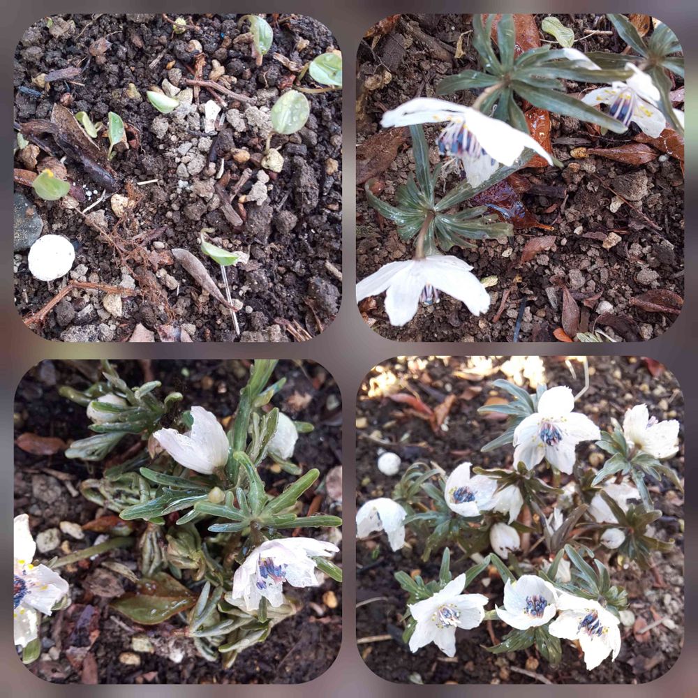 我が家の節分草はのんびり屋さんで毎年節分をかなりの過ぎてから咲きます。毎年種が出来たら回りに蒔いておいたら増えて来ました。左上が昨年蒔いて今年発芽した子です。