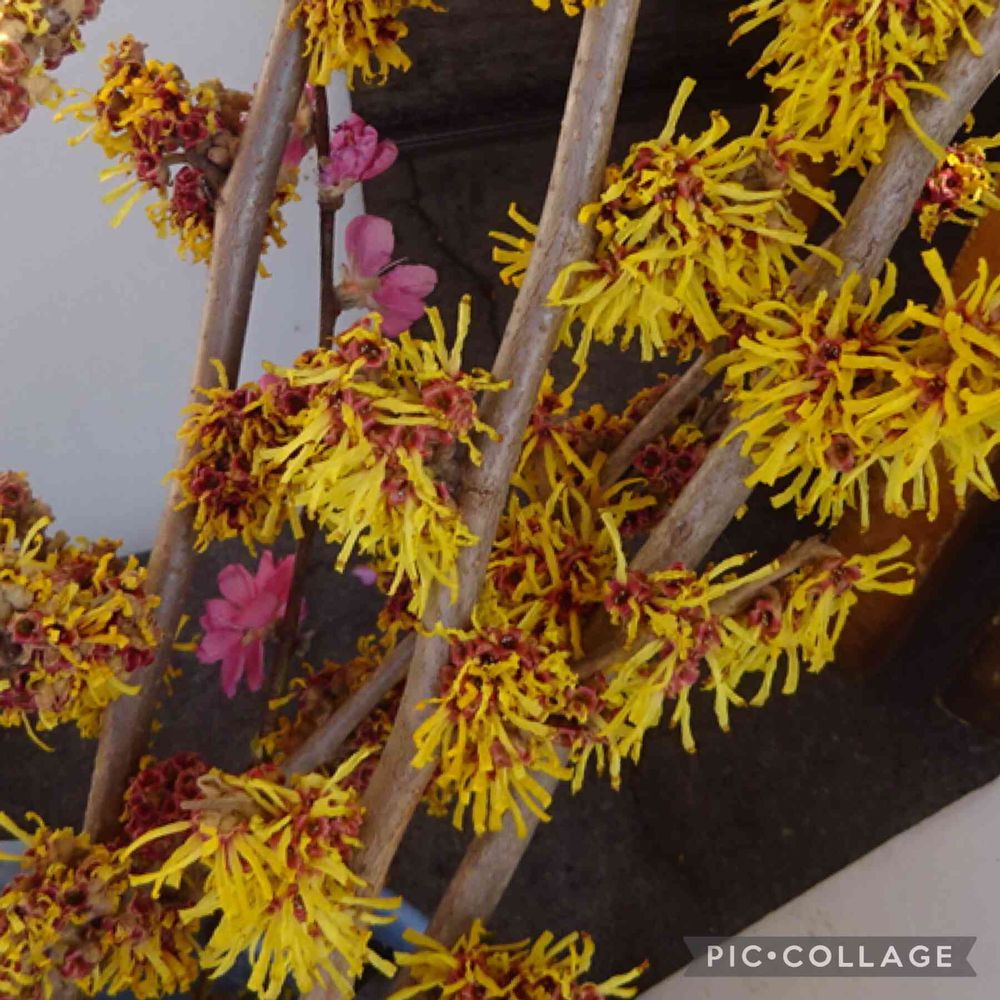 マンサクの花とピンク色の桃の花、桃の節句も近いし、想像するのは楽しいですね💕