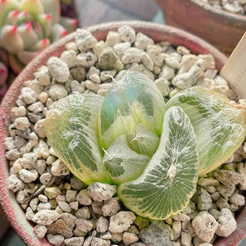 この子は、ブルビネ属メセンブリアントイデスです。個体差もあるのですが、窓から光の加減でブルーの宝石のような色が見られる事で知られてます^^ ハオルチアではないんですよ〜。ちょっと水が切れてくると葉を触るとブリンブリンで気持ちい子です♡