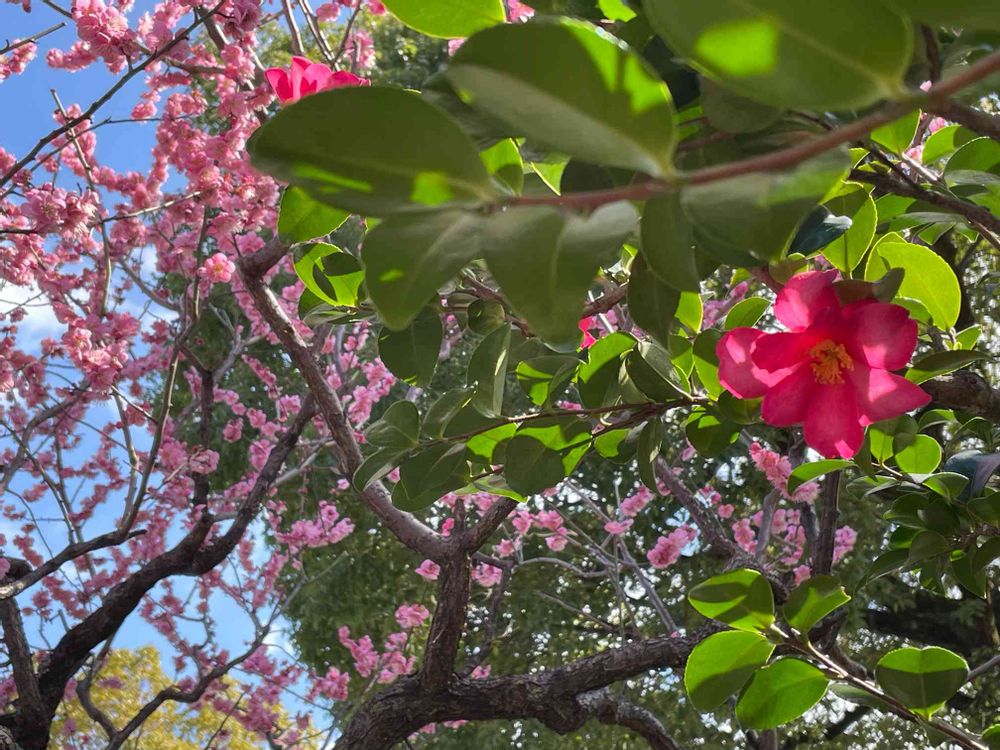 昨日都立公園でサザンカと紅梅をコラボで、サザンカに木漏れ日がスポットライトのようにあたった瞬間でした😊✨🌺