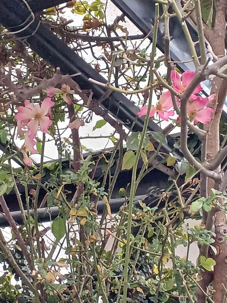 いつもカーポートの上に咲いているご近所のツルバラ🌹高過ぎて写真に撮れなかったのに、カーポートの中で咲いていました❗嬉しくてパチリ📱