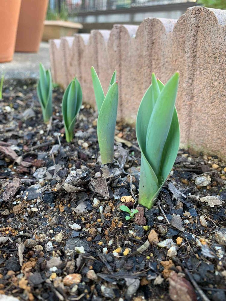 球根が小さかったので今年は咲かないかもしれませんが、花壇の隅に地植えしておきました🌷並んで発芽している様が可愛い😍