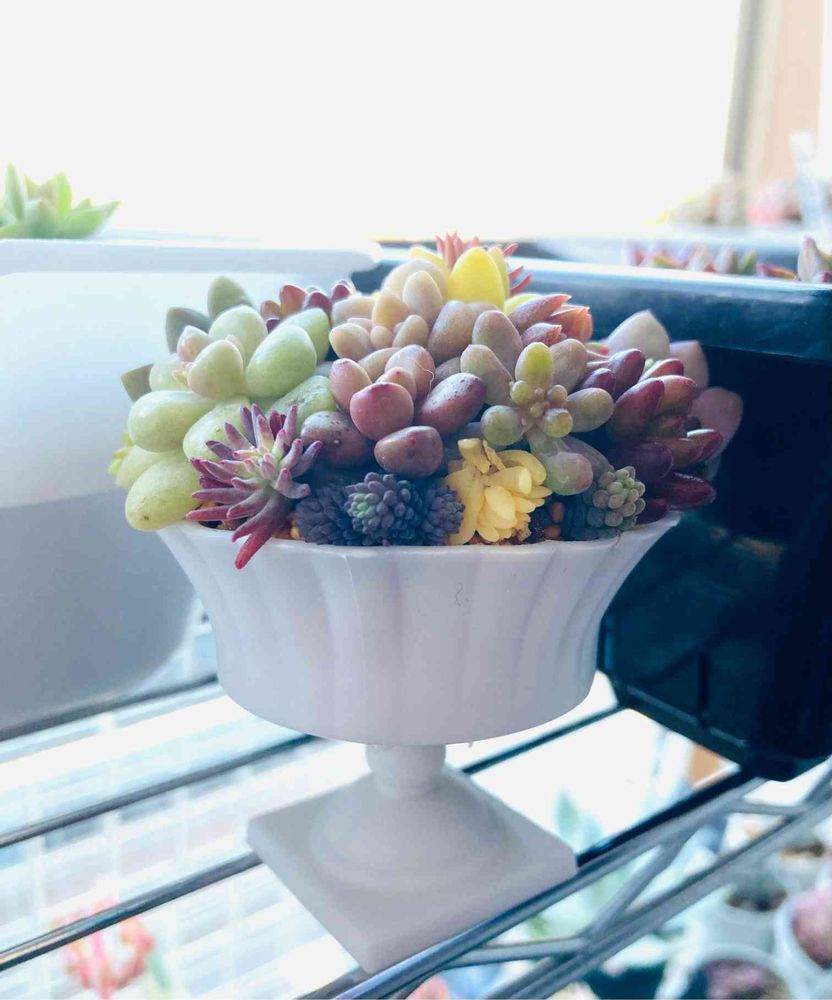 まだまだ小苗があったので、セリアのミニチュアコーナーにあった…これはなんだろう🤔カップ?に穴開けて寄せました✨