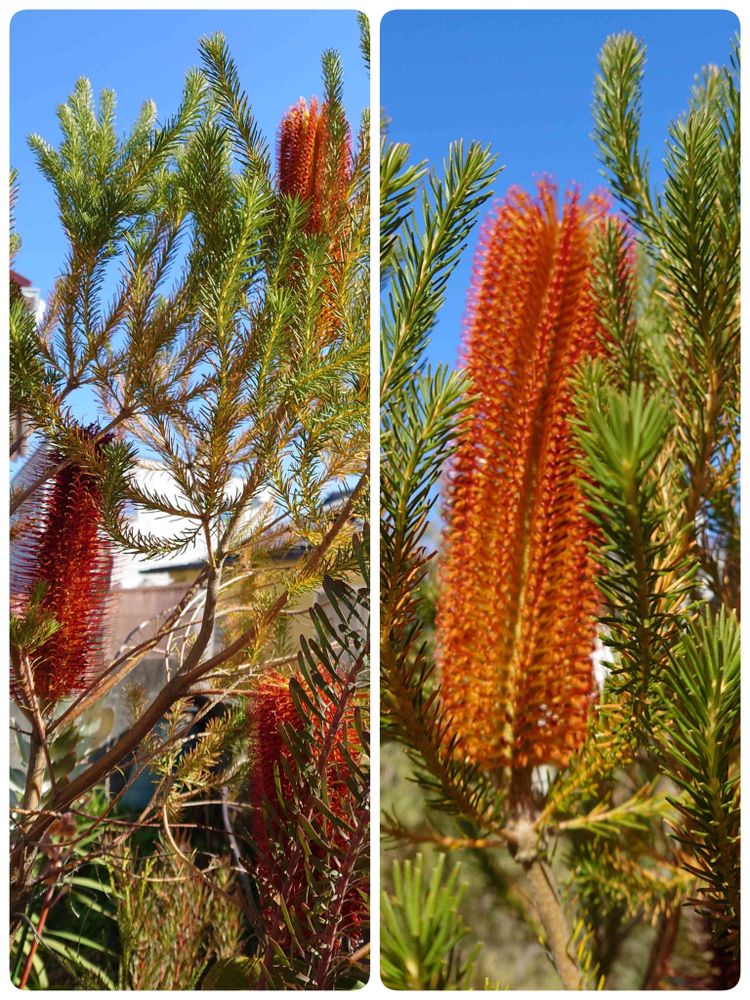 バンクシア〜下から順番に咲いて来て、テッペンのはまだまだ赤くなって無い〜花期が長いから嬉しいなぁ〜花が20センチはあるから見応えあり✨
