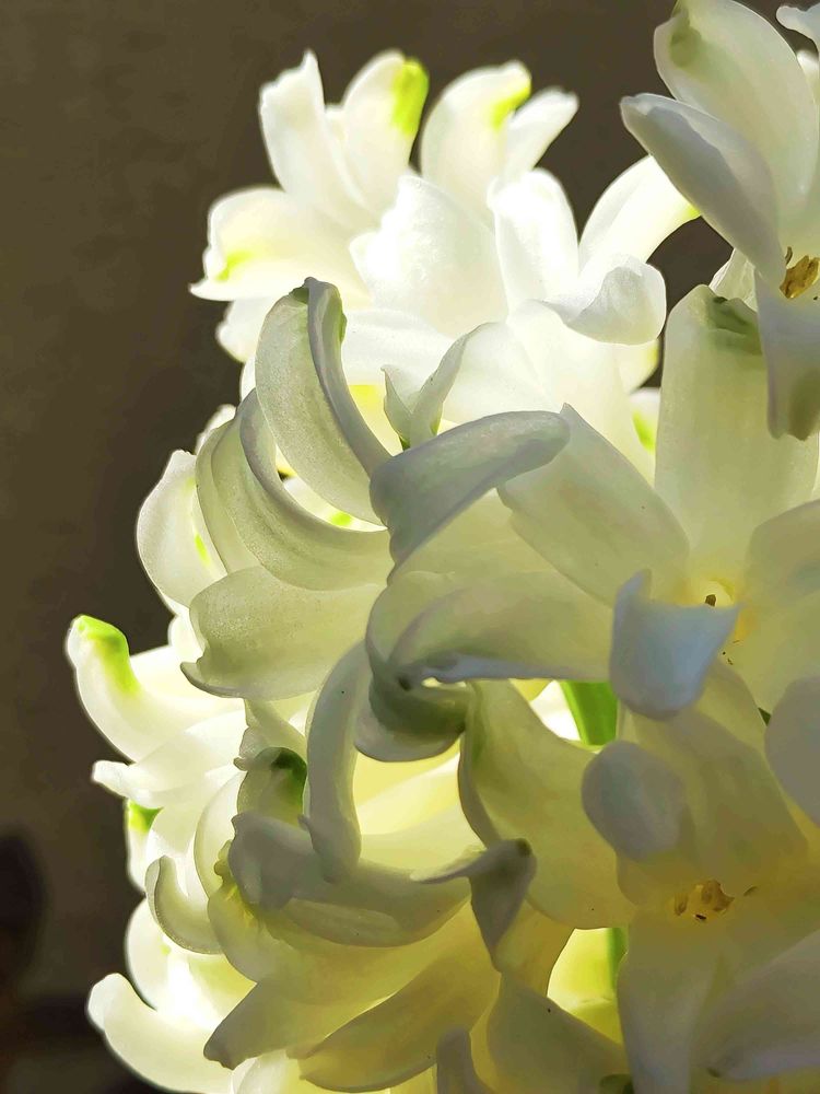 春の光と影で白いヒヤシンスが少し憂いを帯びたようにも見えました。