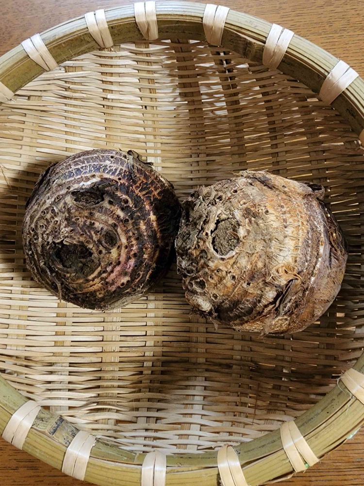 畑に里芋の親玉を植えに来た方とお会いしたら、「親玉、食べてみる❔ 少し硬いかも。」と言ってくださいました。