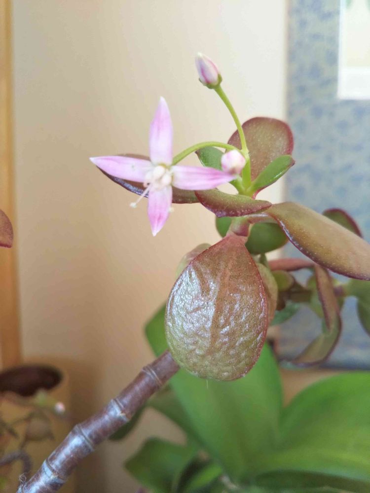 <地道投稿・貰い物>おはようございます😓もうお昼ですね😅「フチベニベンケイソウ・金のなる木」一輪(今確認)咲いてくれました、火の気のない和室(この冬三回暖房)に置いてます。集落の先輩からもらい両手以下の育成期間(年)花芽は「なる木」に四ヶ所のみ😒「日頃の管理は❔」😣聞かれると🙊言えない😓 咲くと綺麗ですね、何せこの寒い時期に😀咲くのですから。