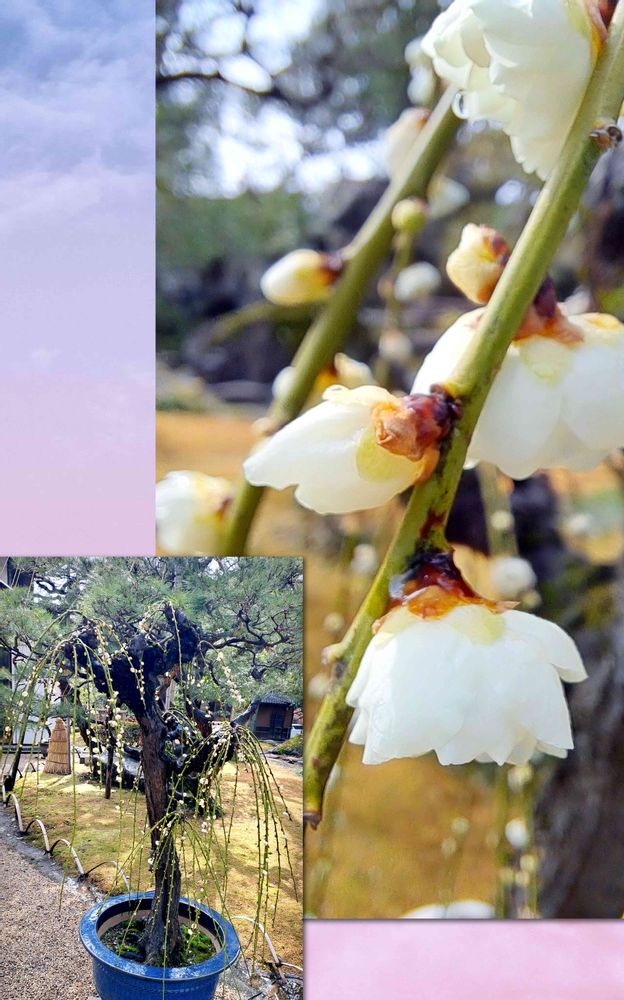 こちらも、滋賀県長浜盆梅展のお庭にある垂れ梅(白)です💕
