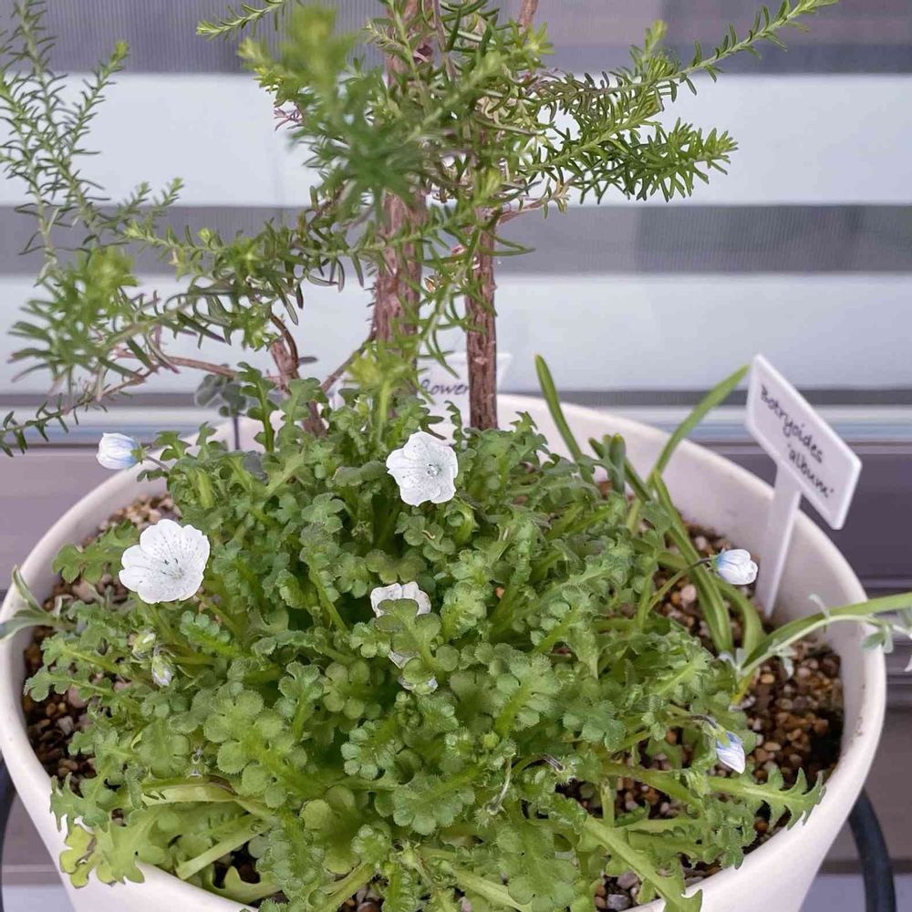 ライスフラワーの足元に色々寄せ植えしています。他のリーフ類はまだまだ成長途中。1番立派なネモフィラが早々開花しました。