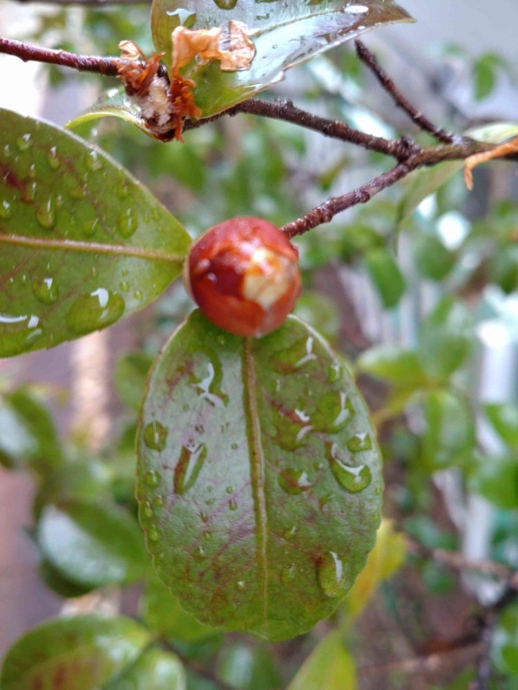 我が家のサザンカ(白)の残された蕾 水滴をまとって