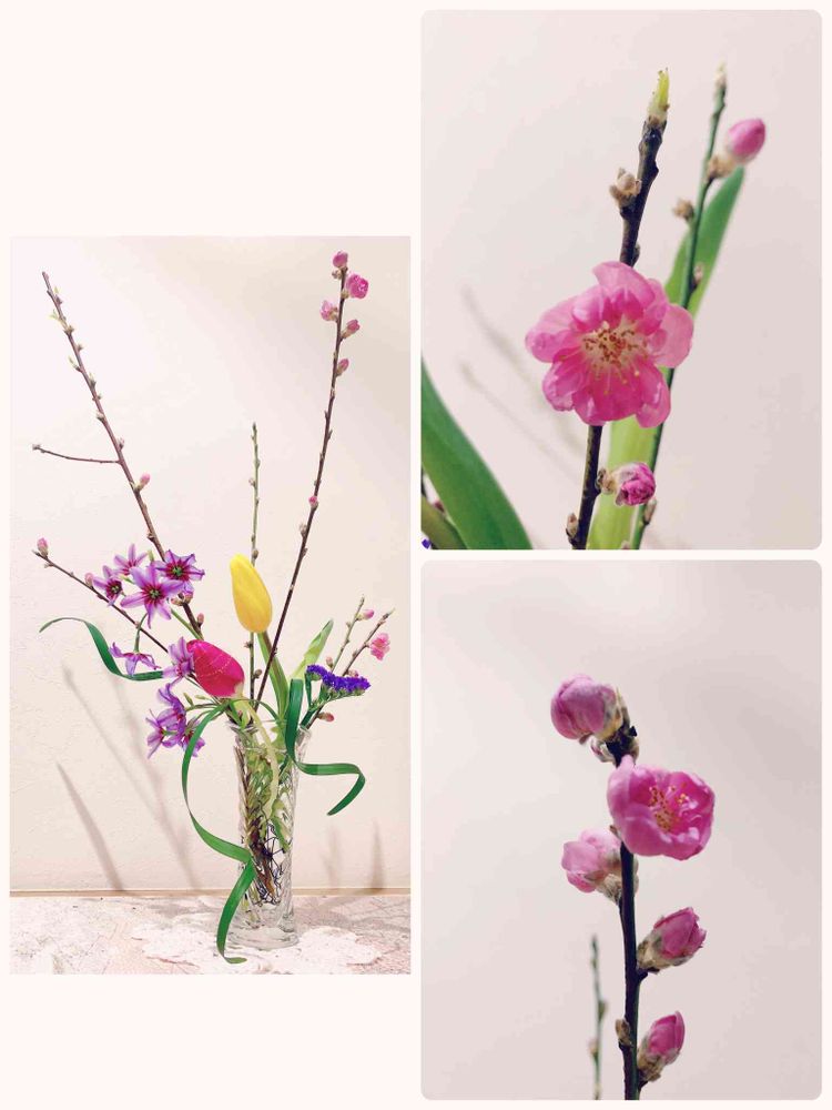 疲れてたけど、開花した桃の花見てたら、アレンジしたくなって💕出来立てのホヤホヤ〜(๑˃̵ᴗ˂̵)