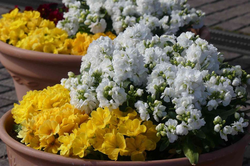 美しいストックとプリムラの寄せ植え。