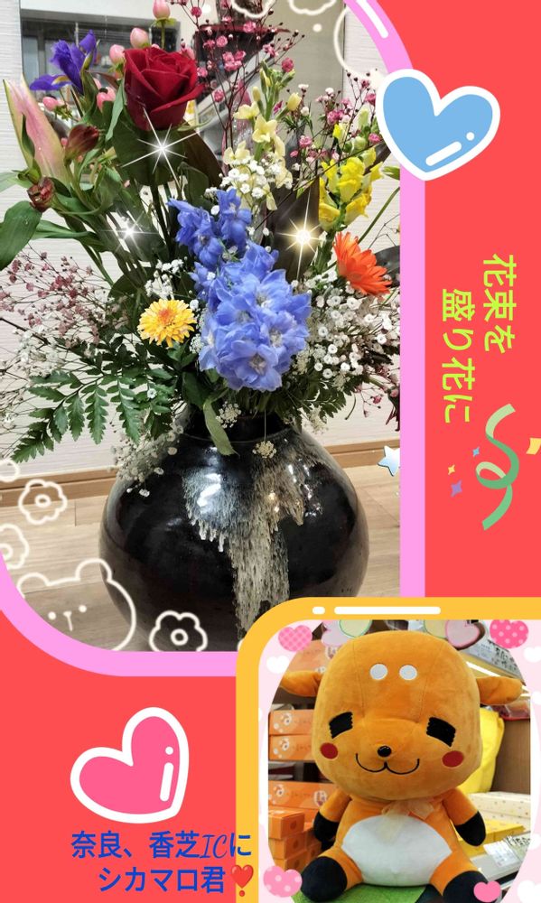 きれいなお花とシカマロ君のかわいいお写真ですね。