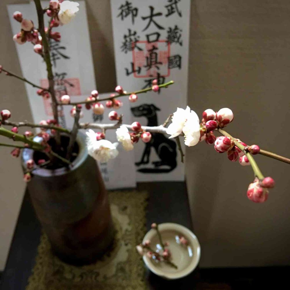 花が途切れて寂しい玄関に梅🌸の枝に来ていただきました。