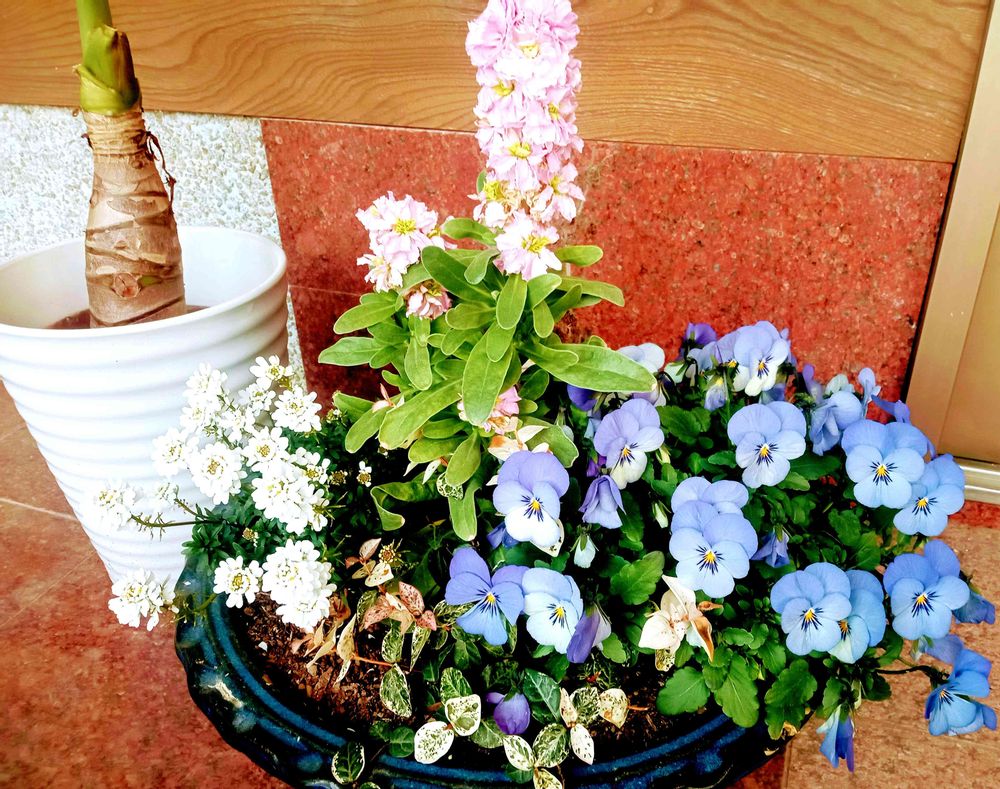 ビオラとストックの寄せ植え、相性良さそうですね☺️✨バランス取れてて雰囲気が自然なところが素敵d(^_^o)