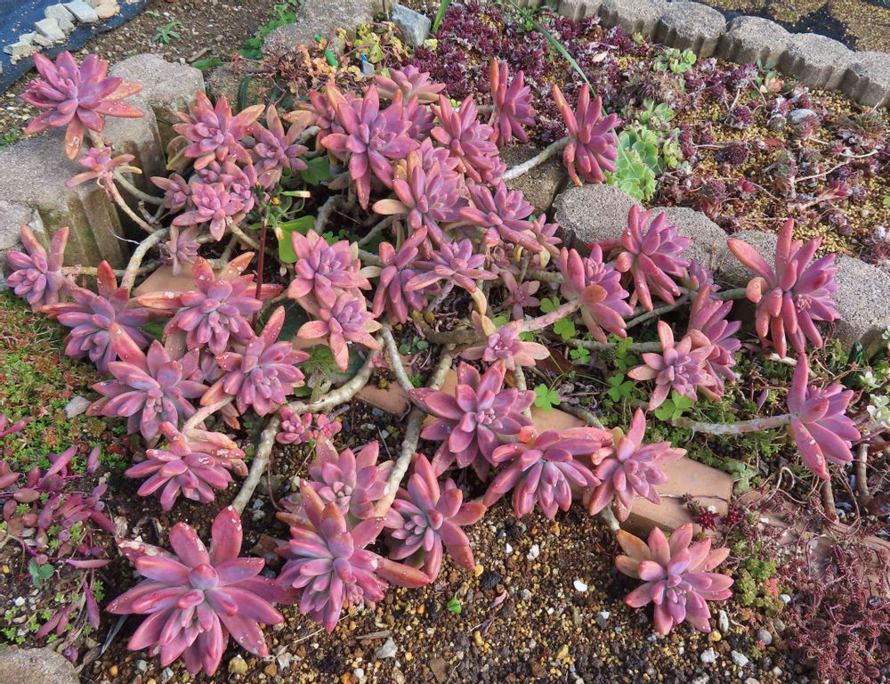 半日陽が当たる地植えコーナーの秋麗。冬の間に何度も寒気に当てられたせいか,すべての葉が紫に染まった。