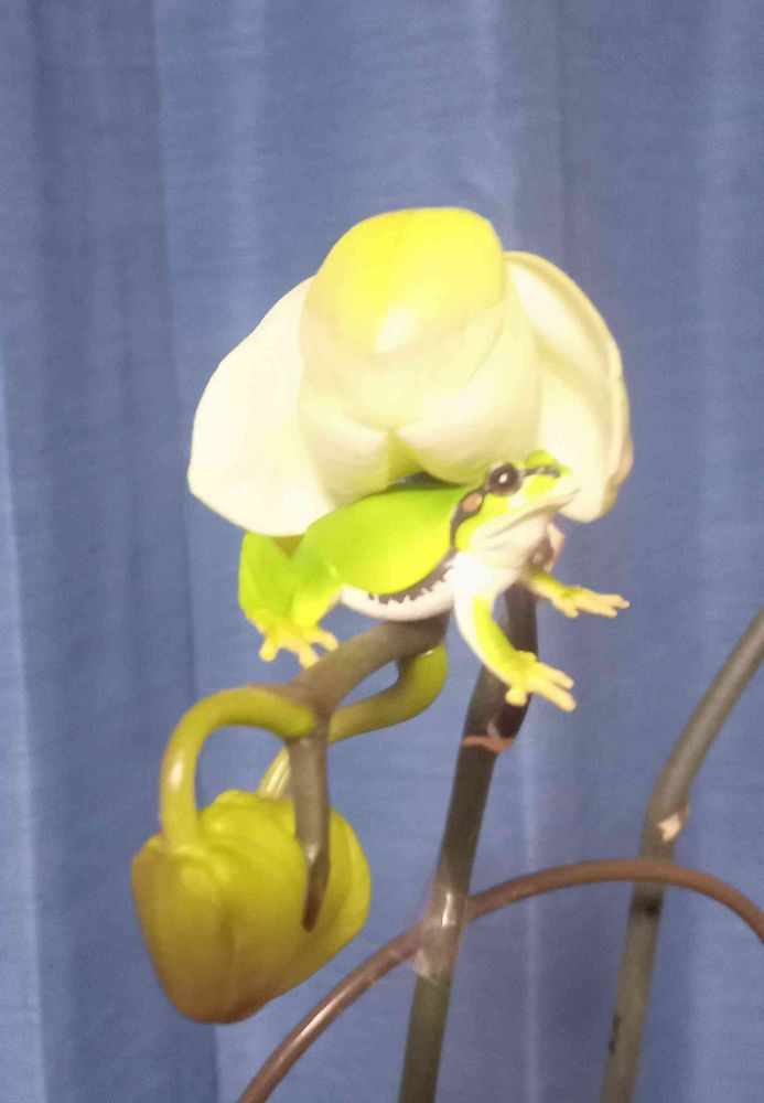 さん🐸✨嬉しすぎて挟めてあげました😂😂😂胡蝶蘭の蕾が、く、苦しいと言ってるようで🤣🤣🤣ゴメンだケロ🐸🥹🥹🥹
