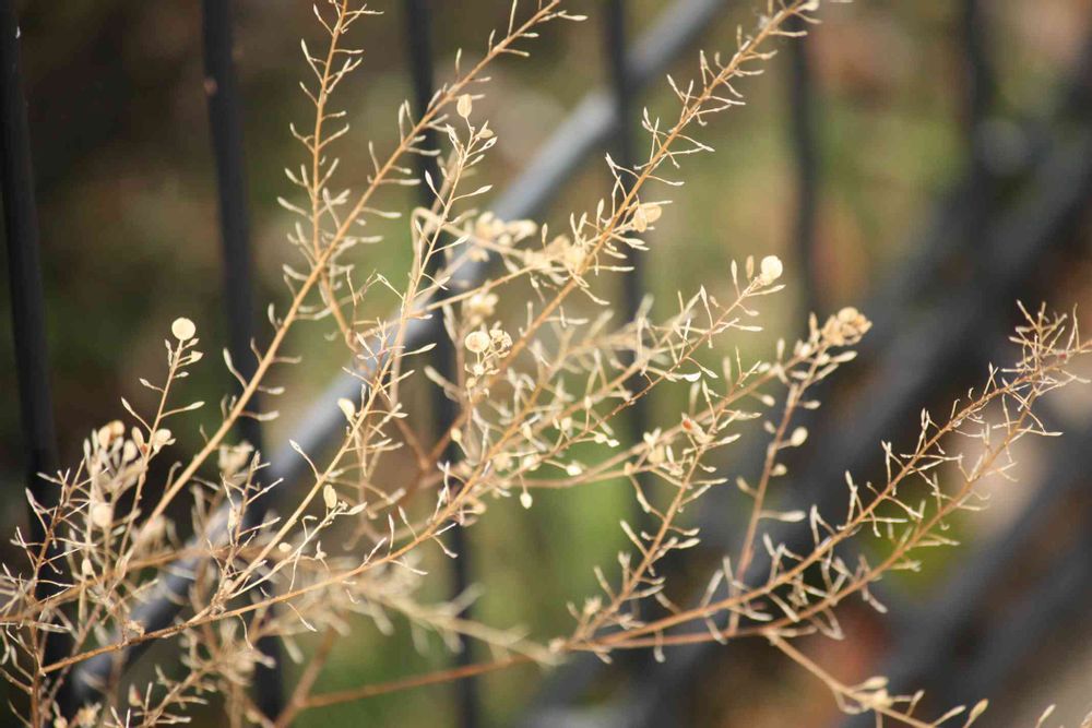 フェンスの向こうから「はぁ〜い、撮ってよ♪」とでも言っているかの如く、歩道側に身を乗り出した立ち枯れマメグンバイナズナさん🎶