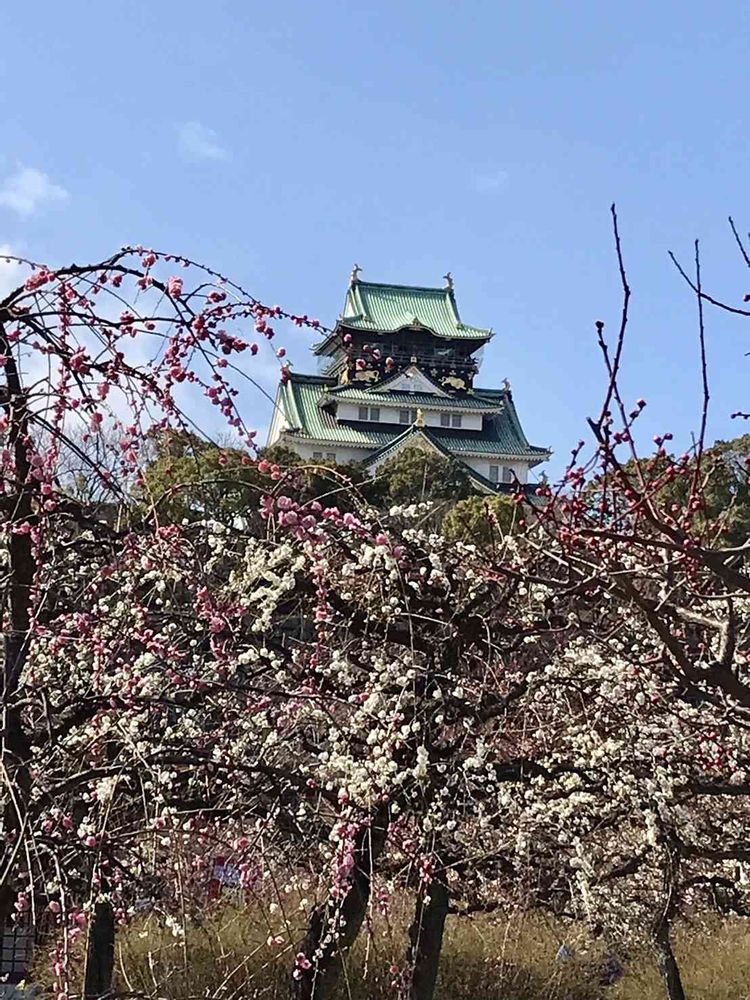 大阪城を、背景にした白梅、紅梅の華やぎ素敵だなぁ🎵