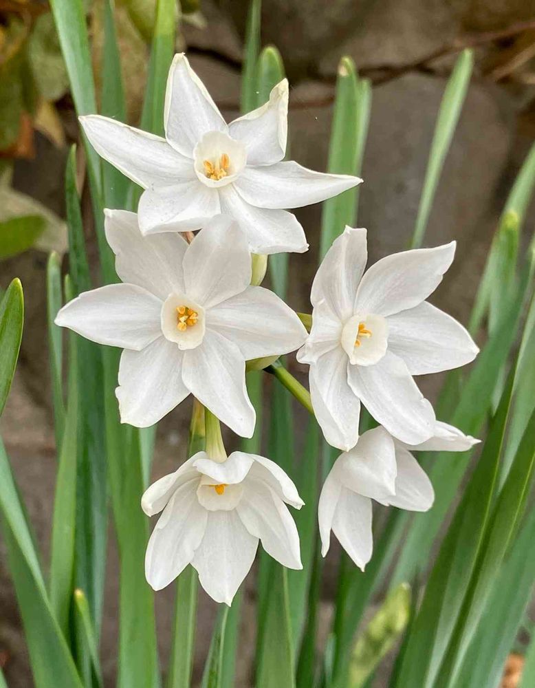 石垣塀の前で咲くペーパーホワイト🍃🍂