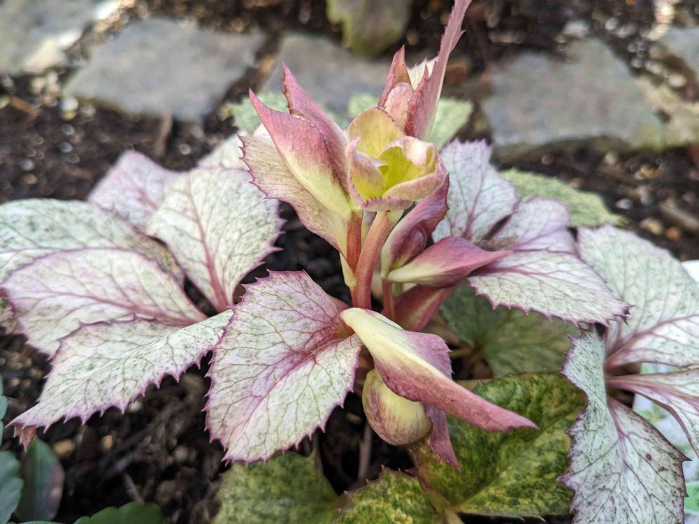 ヘレボルス・スティルニーにも蕾らしき膨らみが。新しい葉と同じくクリーム色にピンクの配色です。