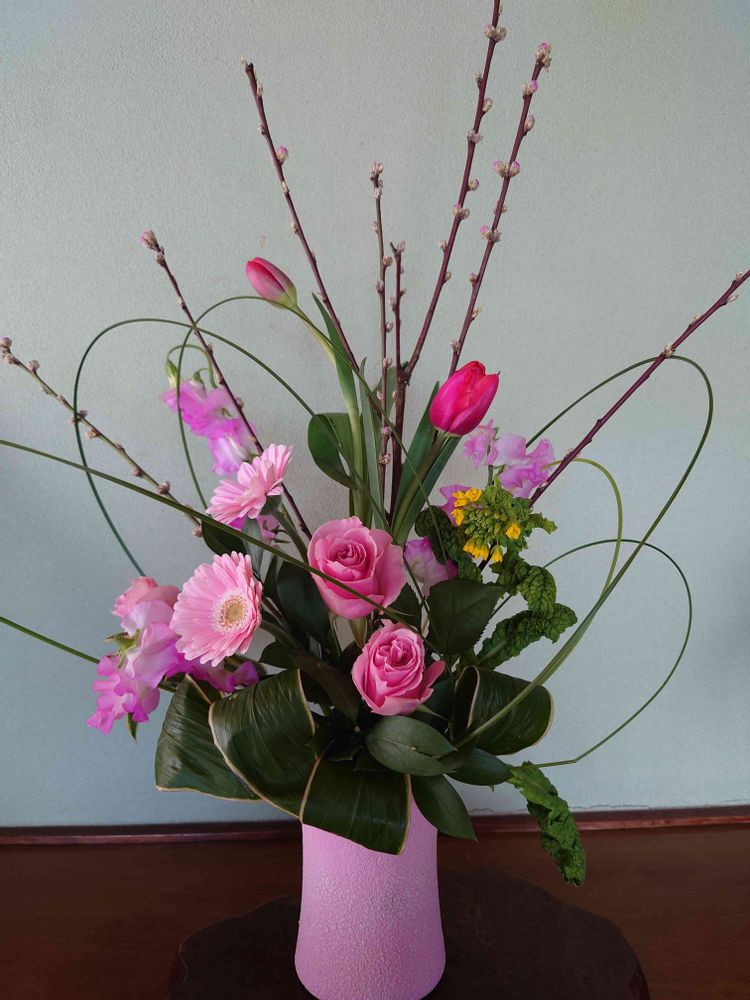 ピンク系のお花🌼を引き締める、グリーンが効いていますね。