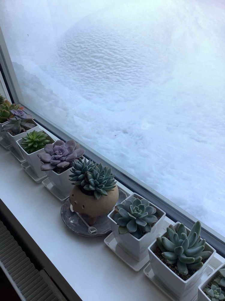 窓辺の多肉たち。背景の庭にはツツジの大株があるのですが、今は雪しか見えません。☃️