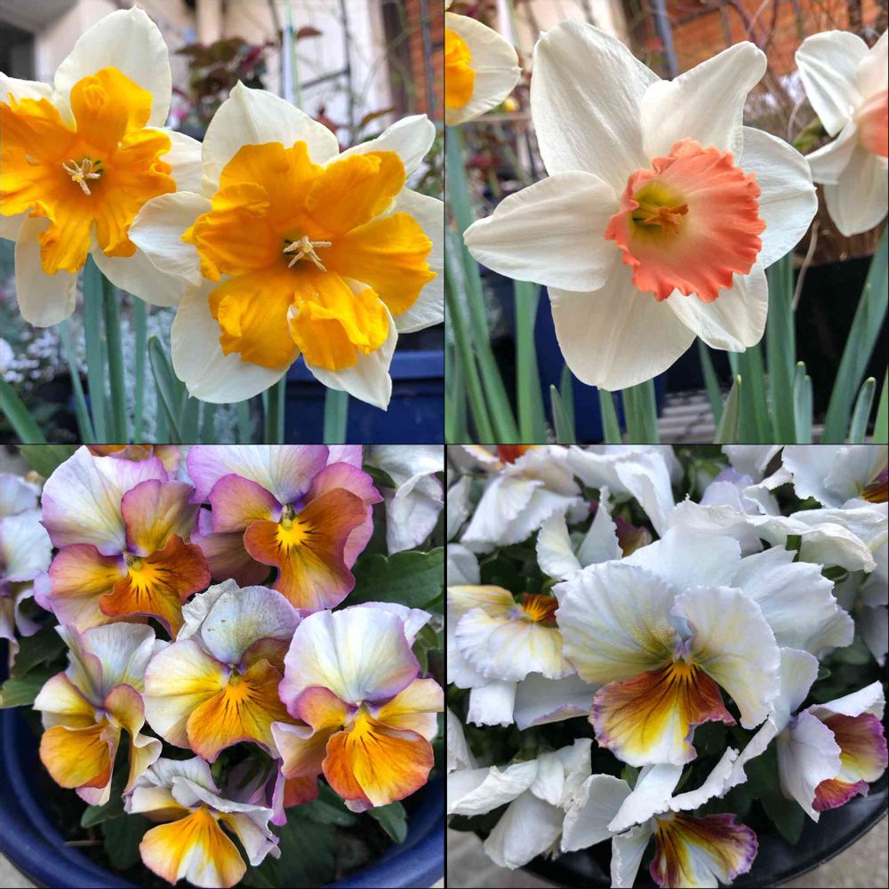 下段は、我が家の矮化系なビオラ2株です。花付きはいいのですが、いかんせん背が伸びないので、鉢を覆うように咲いています😅