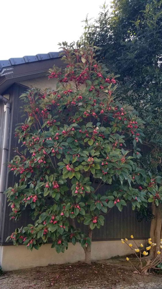 2月から3月にかけて赤い釣り鐘状の花がさちます。葉は肉厚で椿や山茶花のような葉をしています。