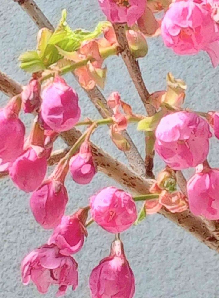 家の玄関脇 鉢植え河津桜 やっと満開になりました