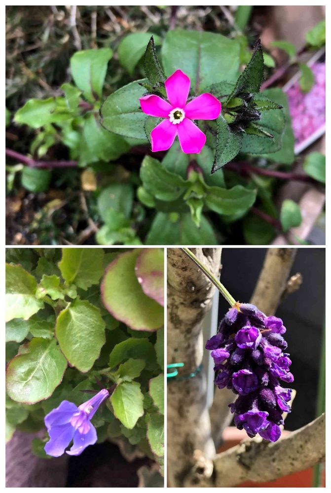 零れ種で2年ぶりに咲いたシレネ(スパニッシュフラメンコ)とロベリア。右下は一年草と書いてあったけど一年中咲き続けているラベンダー😊どれも満開じゃなくて、ひっそり咲いてるとこが愛おしいです😊