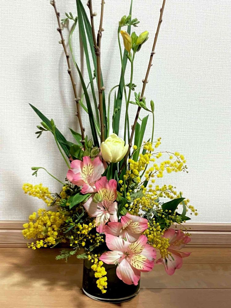 アレンジメント、とっても素敵ねヽ(`▽´)/前の、華やかなお花はアルストロメリア??😀こんなふうに使うって、新鮮です。綺麗ね。