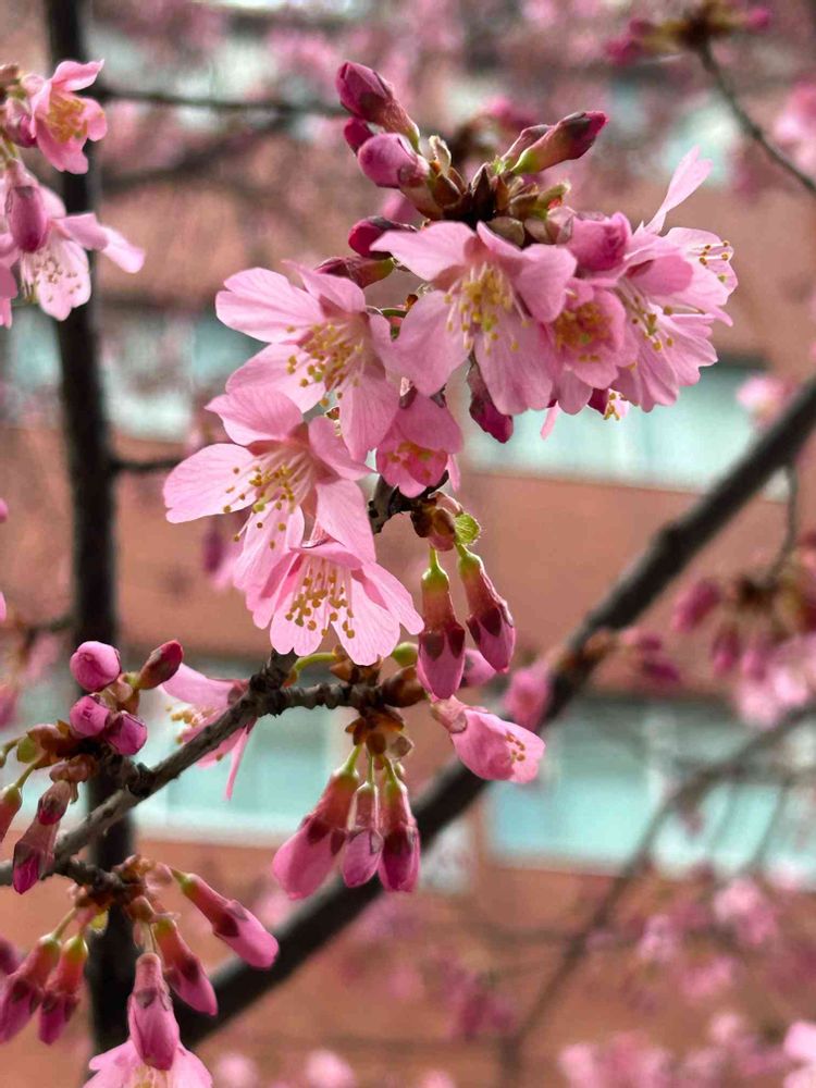 朝の通勤路、街路樹のオカメザクラが開花しています🤗🎶