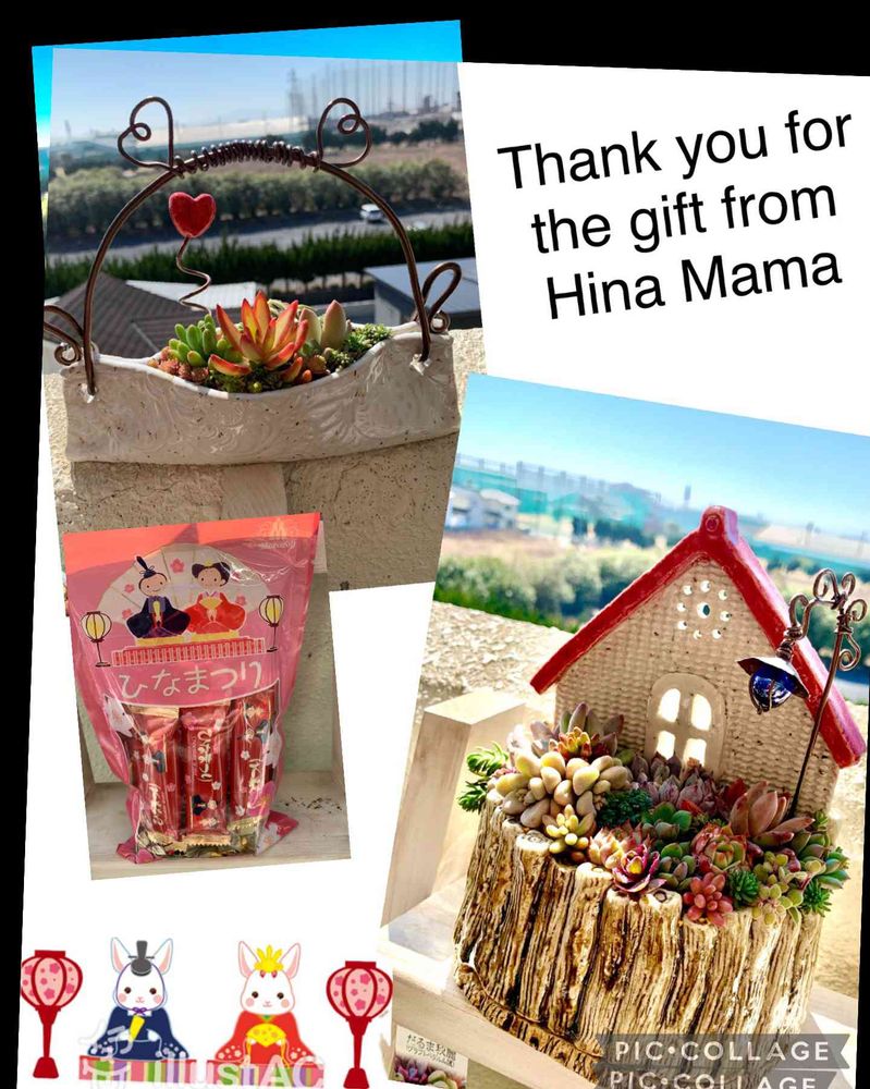 ひなママ chan❣️の作品の中から、好きなものをって💕⤴️赤い屋根の切株ハウスを選んだら、もう一つ💕素敵な模様のオムレット鉢と沢山の多肉をプレゼント🎁
